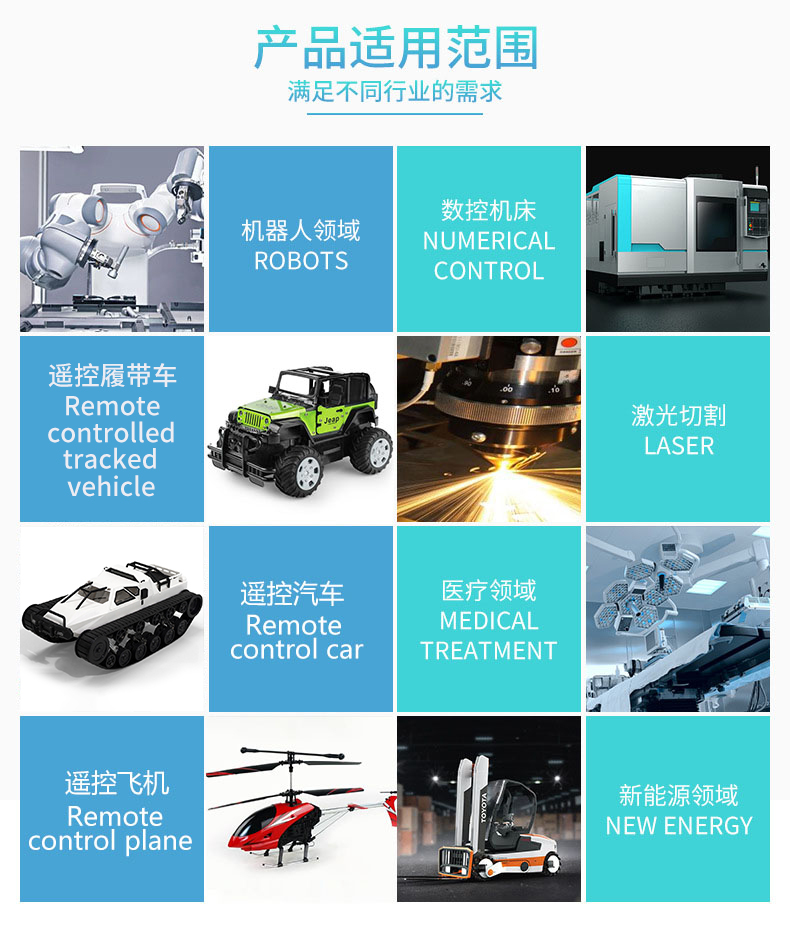 搖控機(jī)器人、搖控汽車(chē)、搖控運(yùn)輸車(chē)、電動(dòng)葫蘆等領(lǐng)域。